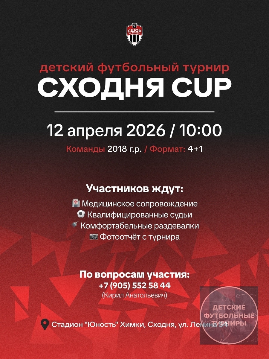 Приглашаем на [https://vk.ru/club223631015|Сходня CUP] 🗓 12 апреля, 10:00 📍СК «Юность» (Химки, Сходня, Ленина 54) ♦ Игроки 2018 г. р. ♦ Формат 4 + 1 Для заявки: +7 (905) 552-58-44, Кирил Анатольевич Будем рады видеть вас на турнире! -— #ФутбольныйТурнирАпрель2026 #ФутбольныйТурнирМосковскаяОбласть2026 #ФутбольныйТурнирХимки2026 #ФутбольныйТурнирМосковскаяОбласть2018гр Источник: https://vk.com/wall-178222694_2724