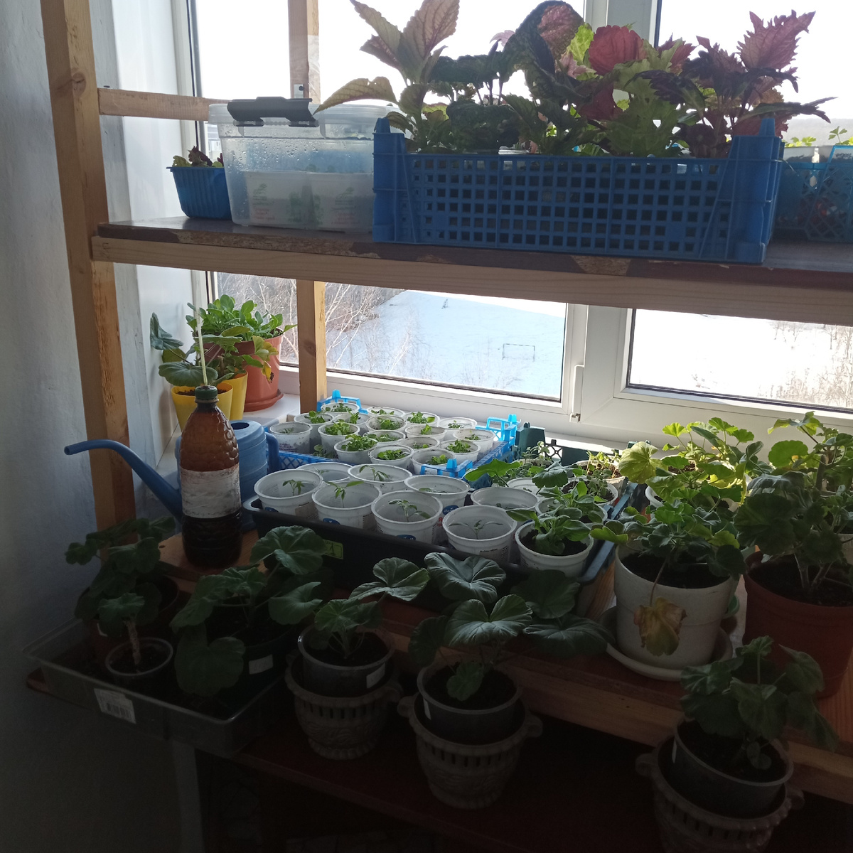 Выставила на лоджию контейнер с укореняшками, а то я их поставила на подоконник с северной стороны, там их прохладно, пусть погреются.