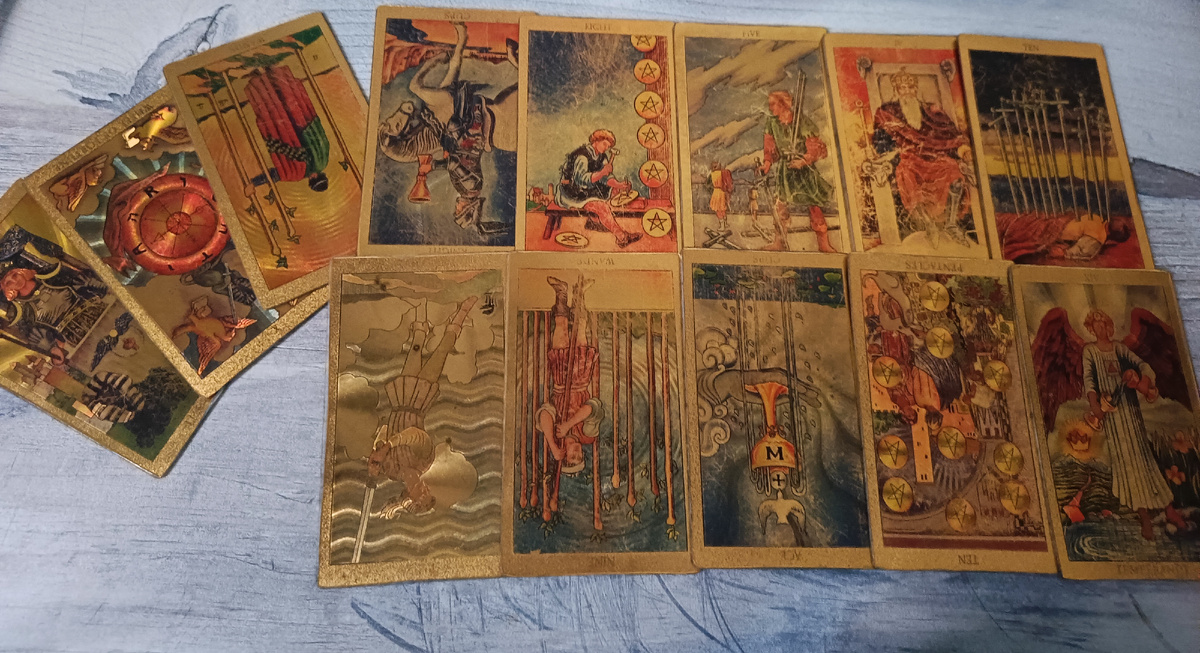 Ситуация, в которой вы расстались с мужчиной, и вам интересно, что же он думает о вас в разлуке, в этой тишине. Слева — три карты сигнификации, чтобы вы поняли, ваша ли это история или нет. Итак, здесь: Колесница, перевернутое Колесо Фортуны и перевернутая Тройка Жезлов (пол Колесницы). Начиналось всё очень круто и хорошо. Скорее всего, вы даже куда-то вместе ездили — у вас были значимые поездки (или просто часто катались на машине). Но, вопреки вашим ожиданиям, эти отношения не привели ни к чему. Начиналось всё прекрасно, у вас были надежды на перспективность союза и планы на будущее, но они растворились в тумане. Причем для вас это было совершенно неожиданно: стол