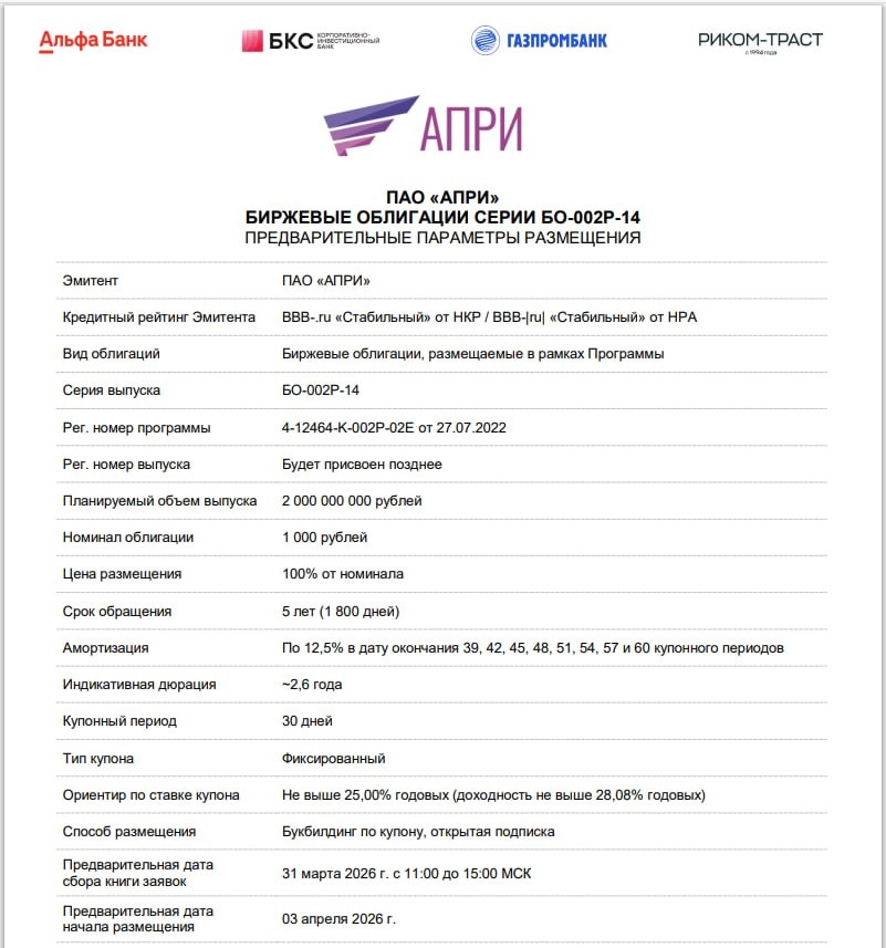 ? На рынке долга готовится новый выпуск облигаций девелопера АПРИ. Компания планирует разместить бумаги серии 002Р-14 объёмом от 2 млрд рублей сроком на 5 лет. Ориентир по купону — до 25% годовых, что соответствует доходности до 28,08% YTM. Для текущего рынка это верхняя граница доходностей в сегменте девелоперов, поэтому имеет смысл посмотреть на эмитента и параметры более детально 👉Что за бизнес и где драйвер роста АПРИ — девелопер, находящийся в фазе активного роста, где ключевой драйвер заключается в масштабировании всей бизнес-модели. Компания наращивает объёмы строительства и продаж, одновременно расширяя проектный портфель. Один из ключевых фокусов сейчас — расширение присутствия в недооцененных курортных регионах с высоким потенциалом, в частности в Кавказских Минеральных Водах. Это отдельный сегмент спроса с более устойчивой динамикой за счёт внутреннего туризма и инвестиционного спроса на апартаменты. 👉Операционная динамика при этом заметно ускоряется В январе—феврале 20