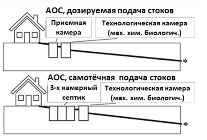 Все АОС были разбиты на два типа, изображенные на рисунке ниже – с дозируемой подачей стоков (насосом) и самотечной. В исследовании участвовало 329 единиц.