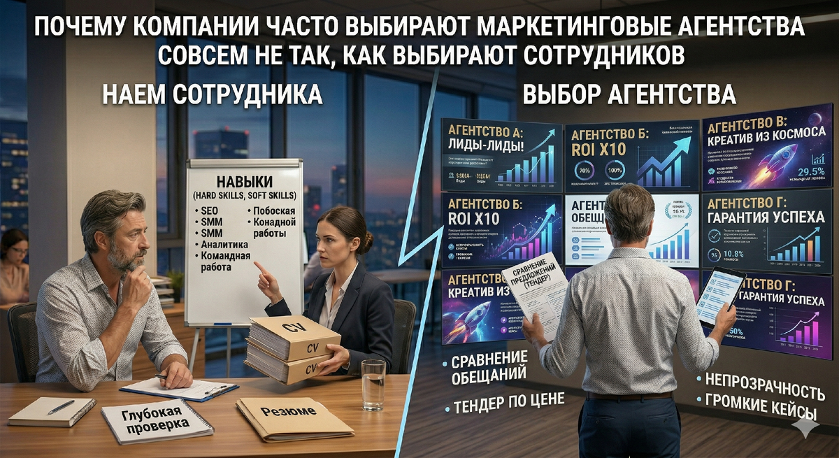 — количество инструментов Иногда решение принимается довольно быстро. Компания просто выбирает того, кто предложил что-то дешевле или пообещал больше заявок. На первый взгляд это кажется логичным. Но есть один важный момент. Маркетинговое агентство — это не просто исполнитель. Во многих случаях оно влияет на одну из ключевых вещей в бизнесе. На поток клиентов. По сути агентство выполняет роль внешней команды маркетинга. А иногда — даже роль директора по маркетингу. Поэтому подход к выбору здесь должен быть примерно таким же, как к в