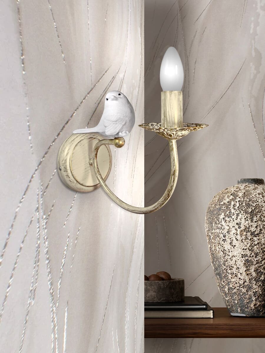 Первое, что покоряет в этой модели, — ее удивительно теплый и уютный облик. Бра птичка настенный S1293-1 выполнено в нежном цвете бежевый с патиной золота. Это не просто окрашивание, а сложное декоративное покрытие, которое придает светильнику эффект благородного винтажа. Бежевый фон выбран не случайно — это один из самых универсальных и «спокойных» цветов в интерьере. Он не перетягивает на себя внимание, а мягко дополняет обстановку, создавая ощущение тепла и защищенности.
