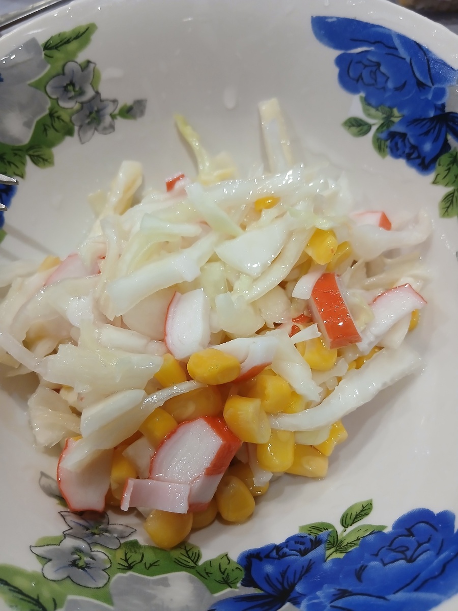 Делюсь рецептом наивкуснейшего и диетического салата из свежей капусты! Для приготовления нам понадобится: свежая капуста, крабовые палочки, консервированная кукуруза, растительное масло, уксус, соль, сахар. Для начала шинкуем капусту, посыпаем солью, «пожмякаем» руками, чтобы она пустила сок и стала мягче. Добавляем кукурузу (у меня это половина банки), режем мелко крабовые палочки. Добавляем растительное масло (3-4 столовых ложки), уксус по вкусу (у меня обычно это 2 столовых ложки), и сахар по вкусу. Хороший получился замес. Всё перемешиваем. Салат готов! Приятного аппетита!!!