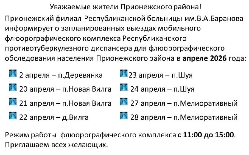 📣📅🚑 Прионежский филиал Республиканской больницы им.В.А.Баранова информирует жителей Прионежского района о проведении флюорографического обследования в апреле 2026 года.