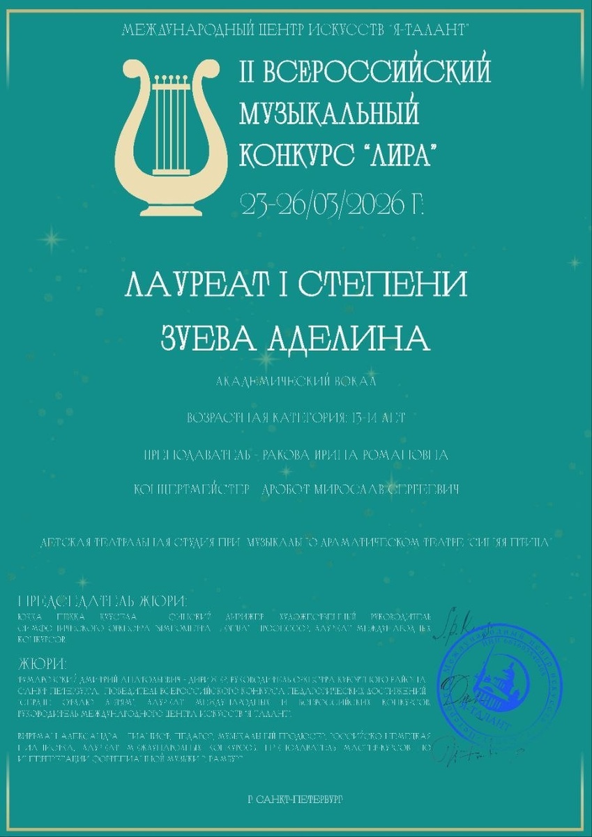 🥇𓏢 🎶 Лауреат 1 степени! II Всероссийский музыкальный конкурс "Лира" («Я-ТАЛАНТ» Международный центр искусств