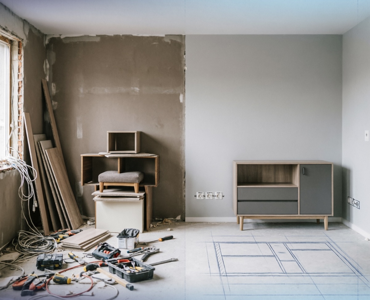 Мы хотим простора, света и многофункциональности. Но как разделить все комнаты на зоны, если каждый квадратный метр на счету? Ответ прост: грамотное зонирование без капитальных перегородок. МЕТОД ПЕРВЫЙ: МЕБЕЛЬ-ТРАНСФОРМЕР КАК РАЗДЕЛИТЕЛЬ. Использование мебели не только по прямому назначению, но и в качестве визуальной границы между зонами. 1. Диван-остров: поставьте диван поперек комнаты спинкой к рабочей зоне или спальне. Помните: расстояние от спинки дивана до стены должно быть не менее 80 см для комфортного прохода. 2. Стеллаж вместо стены: открытый стеллаж высотой до потолка или до середины комнаты пропускает свет, но четко обозначает границу. Глубина стеллажа 30-40 см достаточна для книг и декора, но не перегружает пространство. 3. Барная стойка-полуостров: оптимальная высота 110-115 см, ширина столешницы 60 см. Перед началом работ необходимо: измерить помещение, нарисовать план, определить основные маршруты движения, выбрать мебель и убедиться, что разделитель не перекрывает ест