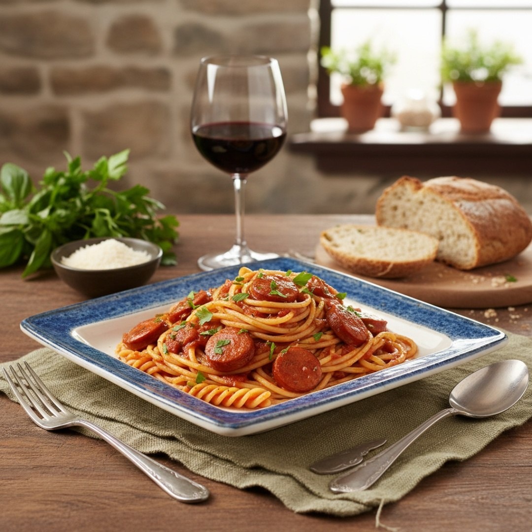 Ингредиенты⤵️ 🔸Спагетти — 300 г 🔸Сосиски — 5 шт. 🔸Томатная паста — 3 ст. л. 🔸Лук репчатый — 1 шт. 🔸Чеснок — 2 зубчика 🔸Растительное масло — 2 ст. л. 🔸Сахар — 1 ч. л. 🔸Соль, перец — 1 щепотка 🔸Орегано — 1 ч. л. 🔸Зелень - 1 пучок Приготовление🍝 1. Спагетти отварить в подсоленной воде до состояния аль денте. Затем слить воду, оставив немного отвара. 2. Лук мелко нарезать, чеснок измельчить. На разогретой сковороде с растительным маслом обжарить лук до прозрачности, затем добавить чеснок и готовить еще 1 минуту. 3. Сосиски нарезать кружочками. Обжаривать до легкого золотистого цвета. 4. В сковороду добавить томатную пасту, воду, сахар, соль, перец и орегано. Перемешать и тушить на среднем огне около 5 минут, чтобы соус немного загустел. 5. Соединить спагетти с соусом, перемешать, добавив немного отвара для сочности. 6. Подавать горячими, посыпав свежей зеленью. Рецепт дня #спагетти #макароны #паста #сосиски #томатный_соус #ужин