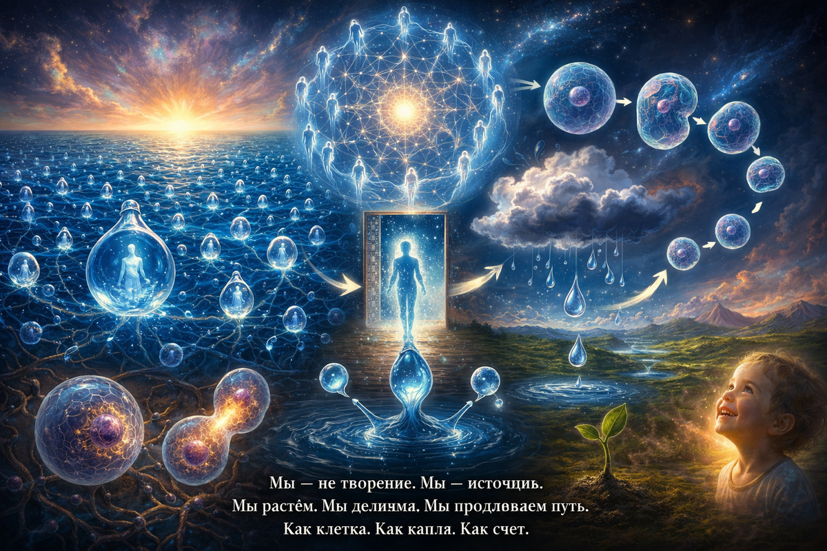 Мы привыкли искать истоки всего в некоем первичном Творце — высшем разуме, отдельном от нас, управляющем миром извне. Но что, если Творца нет? Что, если исток — это мы сами, а новые души рождаются не по чьему-то замыслу, а в результате естественного роста, подобно тому, как растёт и делится живая клетка?