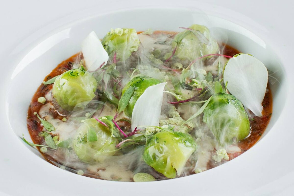 первоисточник: голубцы с брюссельской капустой в Anatoly Komm for Raff House из весеннего обновления меню 2016 года. Хотя, конечно, вряд ли Игорь Гришечкин тогда это видел. Тем не менее, факт есть факт.