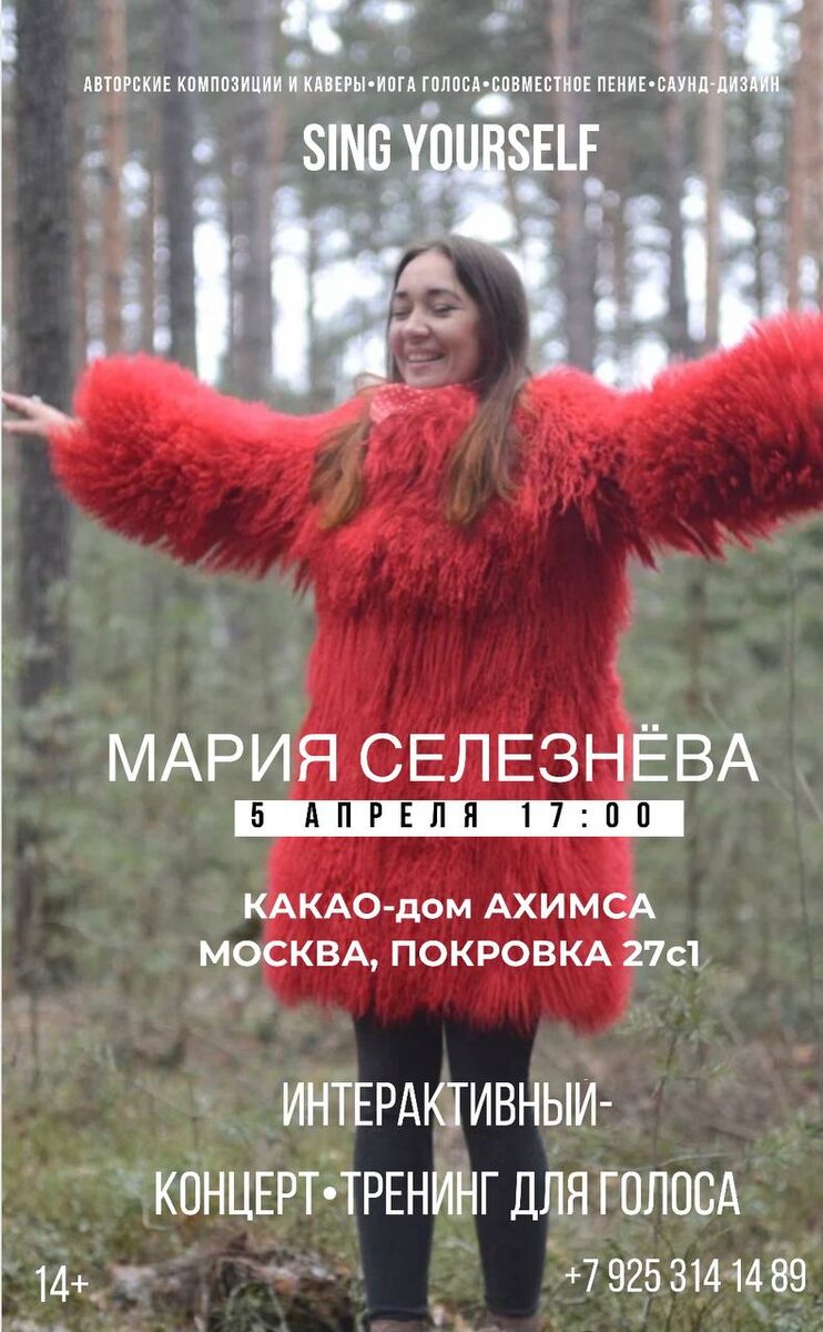 5 апреля с 17 до 19🙌🏼 SING YOURSELF Пой от сердца и усиль свой голосовой потенциал🌟 Практика для Голоса.Тела.Духа 🪶Пространство Ахимса Какао-Дом на Покровке @ahimsa_chocolate Приглашает на интерактивный концерт-тренинг для голоса со мной, певицей и педагогом Марией Селезнёвой. 🎵Программа: * Авторские вокальные аффирмации и певческие игры о жизни и эмоциях — интеллектуальная музыка,самобытные интерпретации * Интерактив: подпевайте, импровизируйте в "звучащем круге", набирайте силу в общем хоре. * Мастер-класс: дыхание, резонанс, мощь, гибкость + персональная обратная связь. 🔥Ваша Мария Селезнёва: певица, композитор, голосовой наставник,вокальный педагог с 2005 года, •Травница и лесотерапевт, совладелица усадьбы ЗемляДел. •Ведущая полугодового голосового марафона ПОЙ ЗВУЧИ СЕБЯ для интернациональной группы в Индии, мастер-артист ДЕНЬ ИНДИИ 2025 в Москве. •Автор проекта ГОЛОС ТРАВ и организатор одноименного фестиваля. 🌟Два часа трансформации через звук: музыка лечит душу,