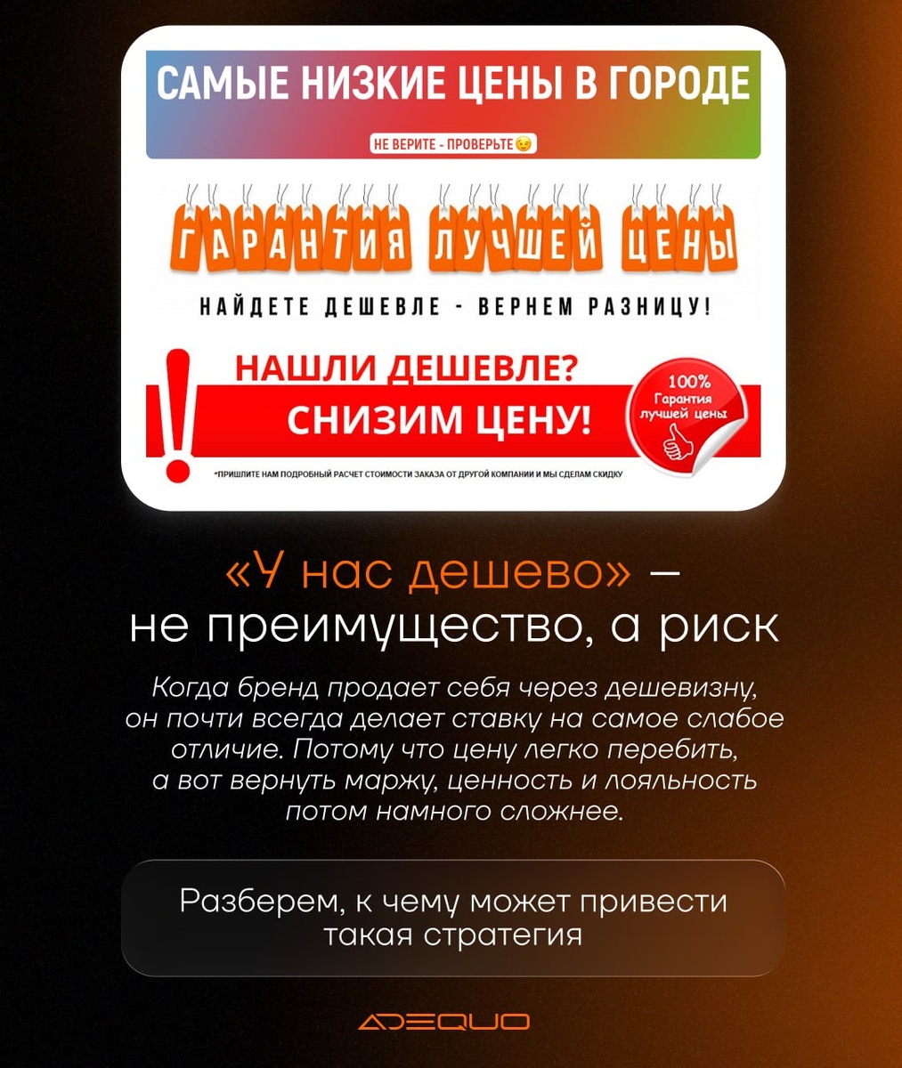Низкий ценник может дать ощущение роста: заявок становится больше, продажи ускоряются, предложение выглядит привлекательнее. Но за этим внешним эффектом часто скрывается совсем другая картина — снижение прибыли, приток случайной аудитории и зависимость от скидок. В карточках разбираем, почему конкуренция через цену часто оказывается ловушкой 🔴