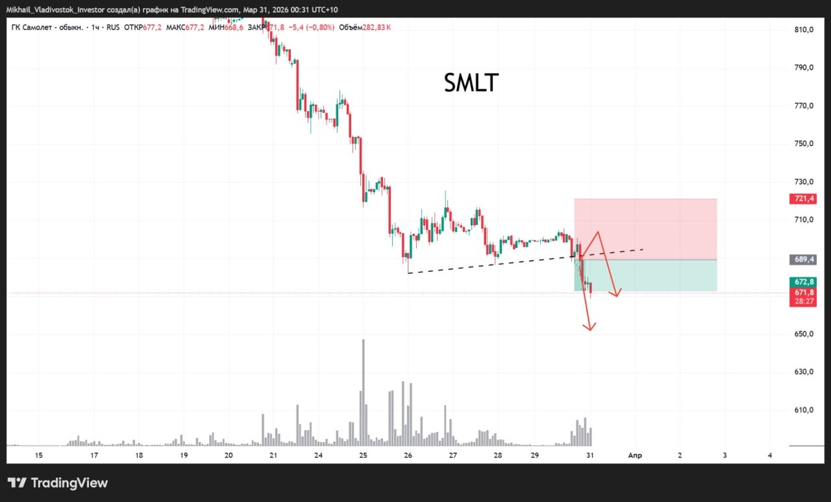 Продолжаю держать легкий шорт по Самолёту $SMLT Стоп уже поставил в безубыток. Спроса пока не видно, а это значит, что цена смотрит пока только вниз #акция #шорт