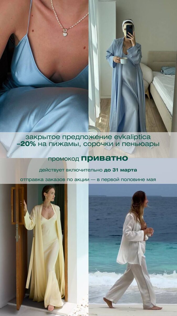 До конца завтрашнего дня 31 марта по промокоду ПРИВАТНО действует –20% на все пижамы, сорочки и пеньюары. Для заказов, оформленных в рамках данной акции, отправка будет осуществлена в первой половине мая. evkaliptica.com