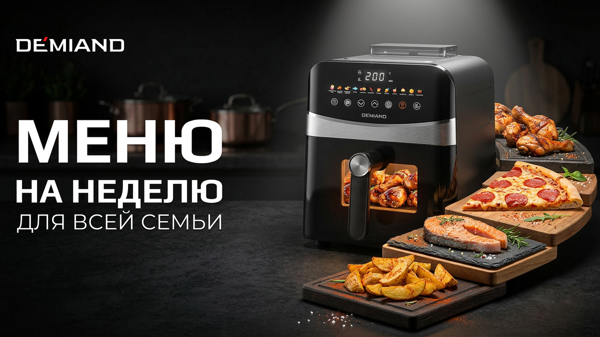 Планирование = свобода. Один раз сели, расписали — и всю неделю голова свободна. ☀️ Воскресенье: планируете меню в приложении Demiand + отправляетесь в магазин со списком продуктов. 📅 Пн–Пт: готовите за 20–30 минут в аэрогриле. 🤖 А ИИ-помощник быстро сориентирует, что приготовить из того, что уже есть в холодильнике. Но чтобы точно весь сценарий от подготовки ингредиентов до горячего блюда к столу был безукоризнен, мы сделали для вас небольшой чек-лист. Приступим? Шаг 1. Составляем каркас меню Не нужно изобретать 21 уникальное блюдо. Используйте простую схему«завтрак ⮕ обед ⮕ ужин» : Совет: готовьте обед с запасом — часть уходит на ужин или на завтрашний ланчбокс. И чаши аэрогриля Demiand Tarvin (4,5 л) точно хватит! 🖤 Ссылка на аэрогриль Demiand Tarvin (чаша 4,5 литров) на WB Шаг 2. Список покупок Мясо и рыба Молочное и яйца Овощи и зелень Крупы и бакалея Фрукты и ягоды Итого: один поход в магазин. Без ежедневных «забежать за чем-нибудь», без спонтанных трат, без лишнего в корзине.