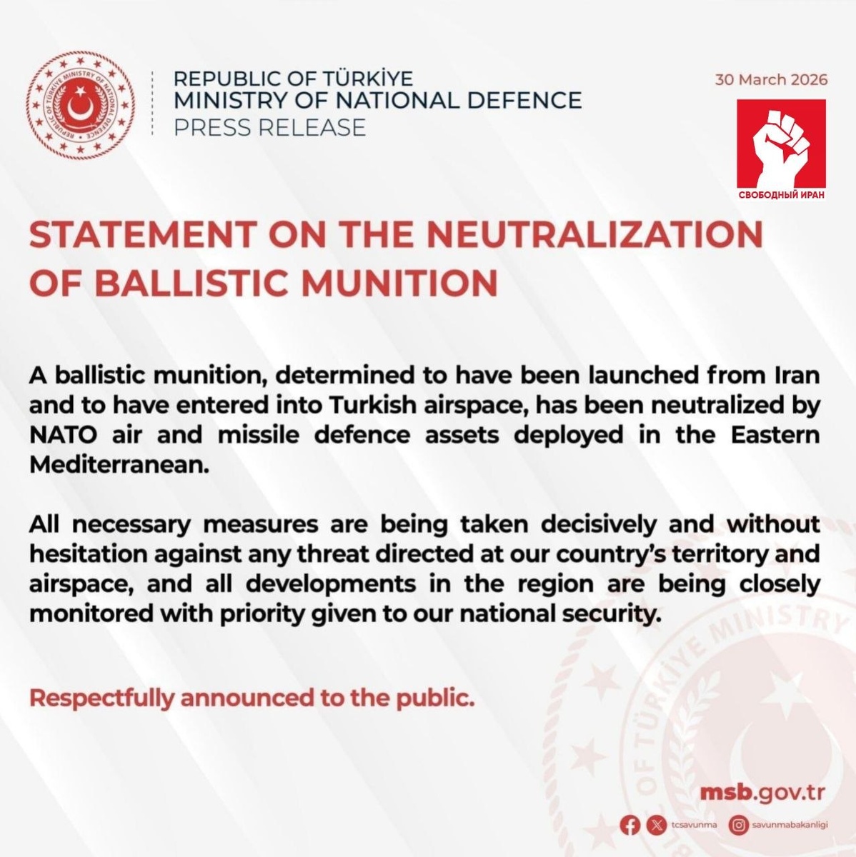 🇹🇷🇮🇷 Срочно: в небе над Турцией сбили баллистическую ракету