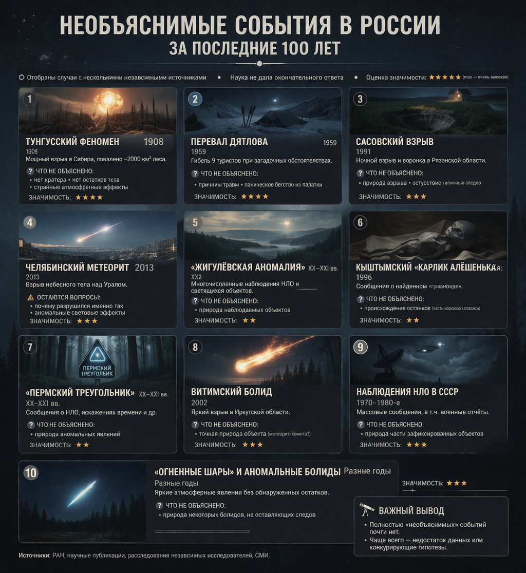 Подборка до 10 событий в России (≈1926–2026), которые часто считаются “необъяснёнными”. Это только те случаи, где: Также для каждого из них мы дали оценку значимости (по шкале: низкая / средняя / высокая / очень высокая). Мощнейший воздушный взрыв в Сибири, уничтоживший ~2000 км² леса. Глобальный научный феномен, до сих пор изучается. Гибель 9 туристов при странных обстоятельствах. Самая известная “тайна” СССР. Ночной взрыв в Рязанской области, образовавший воронку. Локальное, но устойчиво необъяснённое событие. Взрыв небесного тела над Уралом. Хорошо изучено, но с остаточными загадками. Регулярные наблюдения НЛО и странных светящихся объектов. Слабая доказательная база (в основном наблюдения). Сообщение о найденном “гуманоидном существе”. Скорее культурный феномен, чем научная загадка. Сообщения о НЛО, искажениях времени и др. Слабая научная база. Яркий взрыв в Иркутской области. Менее изучен, чем Челябинск. Массовые сообщения, включая официальные военные отчёты. Интересно как феномен