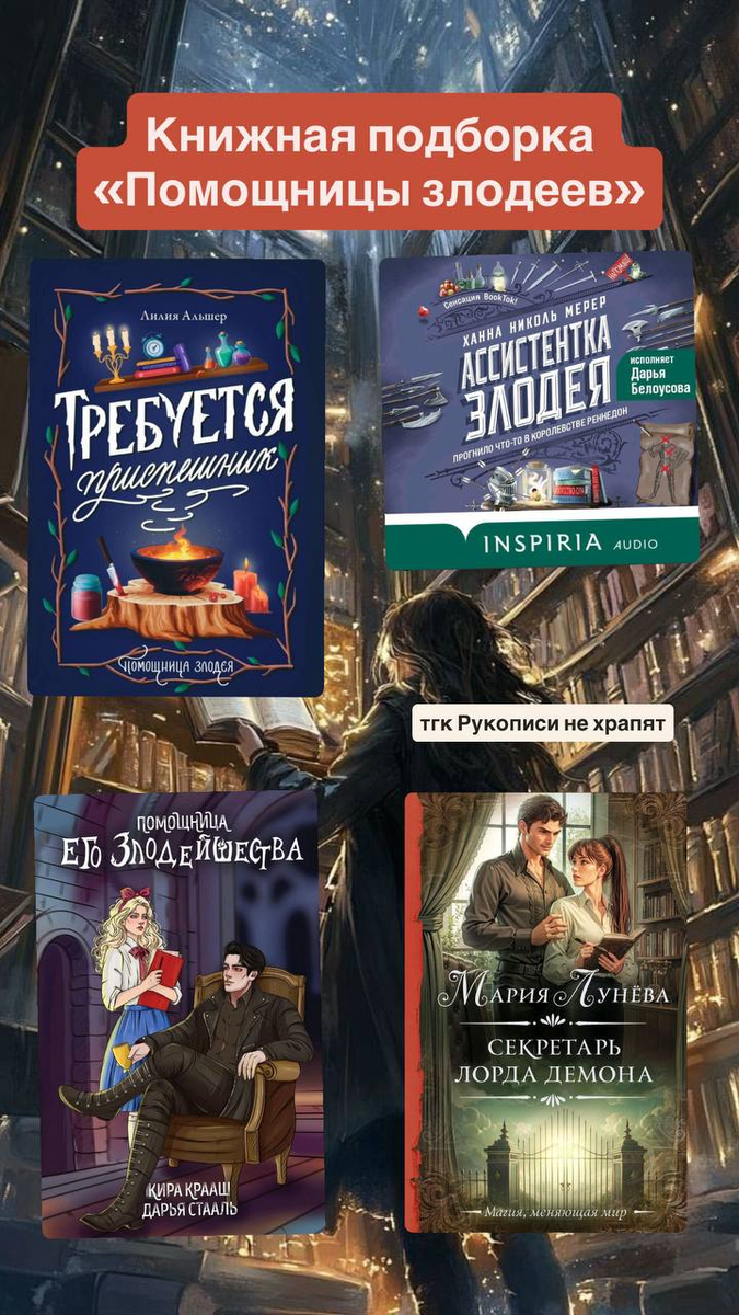Всем прекрасных выходных у нас очередная книжная подборка "Помощницы Злодеев" 😈 1. Лилия Альшер "Требуется приспешник" 2. Кира Краш, Дарья Стааль "Помощница Его Злодейшества" 3. Мария Лунёва "Секретарь лорда Демона" 4. Ханна Николь Мерер "Ассистентка Злодея" Раньше всего отзывы и обзоры на книги выходят у нас в телегам. Подписывайтесь https://t.me/pro_novel