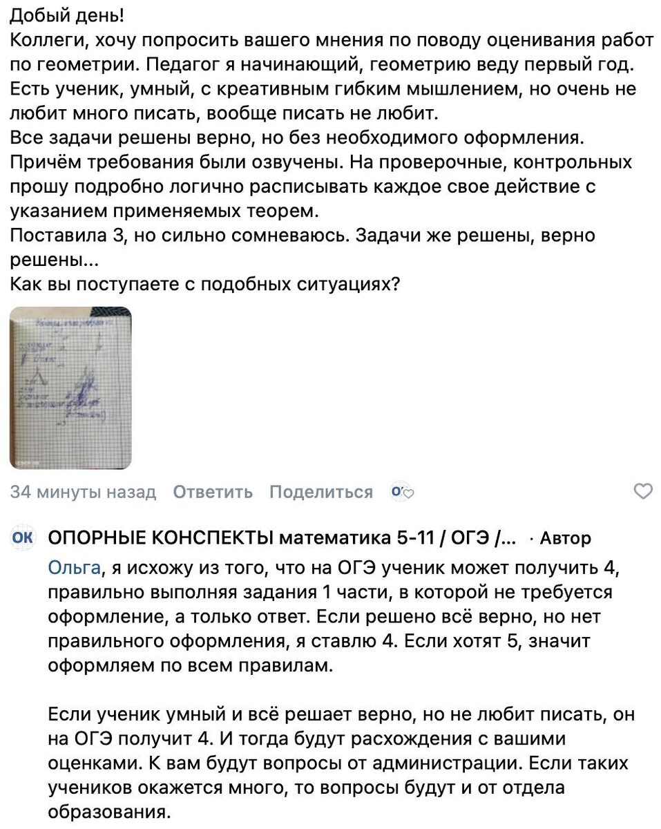 " Вопрос очень важный, поэтому сделала отдельный пост об этом. ❓Вопрос: Добый день! Коллеги, хочу попросить вашего мнения по поводу оценивания работ по геометрии. Педагог я начинающий, геометрию веду первый год. Есть ученик, умный, с креативным гибким мышлением, но очень не любит много писать, вообще писать не любит. Все задачи решены верно, но без необходимого оформления. Причём требования были озвучены. На проверочные, контрольных прошу подробно логично расписывать каждое свое действие с указанием применяемых теорем. Поставила 3, но сильно сомневаюсь. Задачи же решены, верно решены... Как вы поступаете с подобных ситуациях? ✅Ответ: Ольга, я исхожу из того, что на ОГЭ ученик может получить 4, правильно выполняя задания 1 части, в которой не требуется оформление, а только ответ. Если решено всё верно, но нет правильного оформления, я ставлю 4. Если хотят 5, значит оформляем по всем правилам. Если ученик умный и всё решает верно, но не любит писать, он на ОГЭ получит 4. И тогда буд
