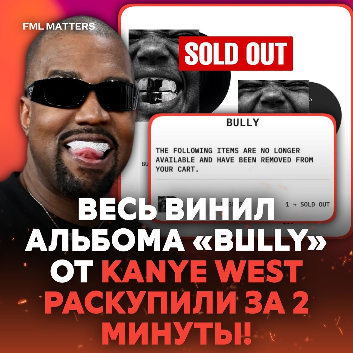 😳 ВЕСЬ ВИНИЛ «BULLY»ОТ KANYE WEST РАСКУПИЛИ ЗА 2 МИНУТЫ! Физические копии «BULLY» от Йе разлетелись буквально за 2 минуты после старта продаж — фанаты моментально разобрали весь тираж. Достойный вышел альбом? ❤️🔥/👎 💀 FML MATTERS