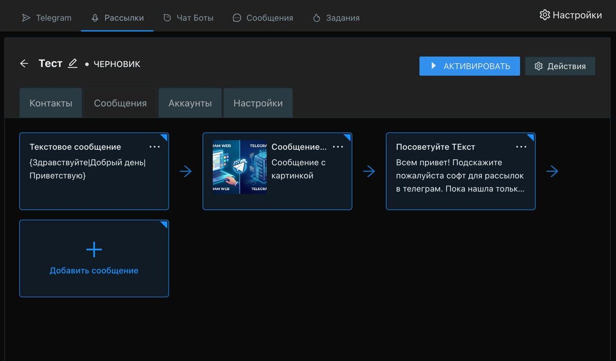 Давно хотел привести в порядок этот блок в рассылках. Потому что ранее изза нескольких категорий сообщений не понятно было визуально какое количество сообщений выбрано и в каком количестве. Изза чего случались неудобные ситуации. Так же не было никакой настройки для действий между несколькими сообщениями. Сейчас сразу визуально видно сколько сообщений выбрано и в каком они порядке. Но самое крутое это тонкая настройка действий для самой цепочки сообщений которая будет отправлена в одном диалоге. С паузой/Без паузы - тут все просто и логически понятно. А дальше начинается магия. Ожидать ответа пользваотеля - Мы не шлем сразу всю цепочку сообщений а ждем когда пользователь ответит и только потом шлем следующее сообщение. Да это не так гибко настраивается как в чат ботах где можно настроить ответ под кокретное ключевое слово, но в большинстве ситуаций это не так важно. Главное соблюсти видимость диалога. А эффективность зависит только от умения писать тексты. Переписать Сообщение - Эт