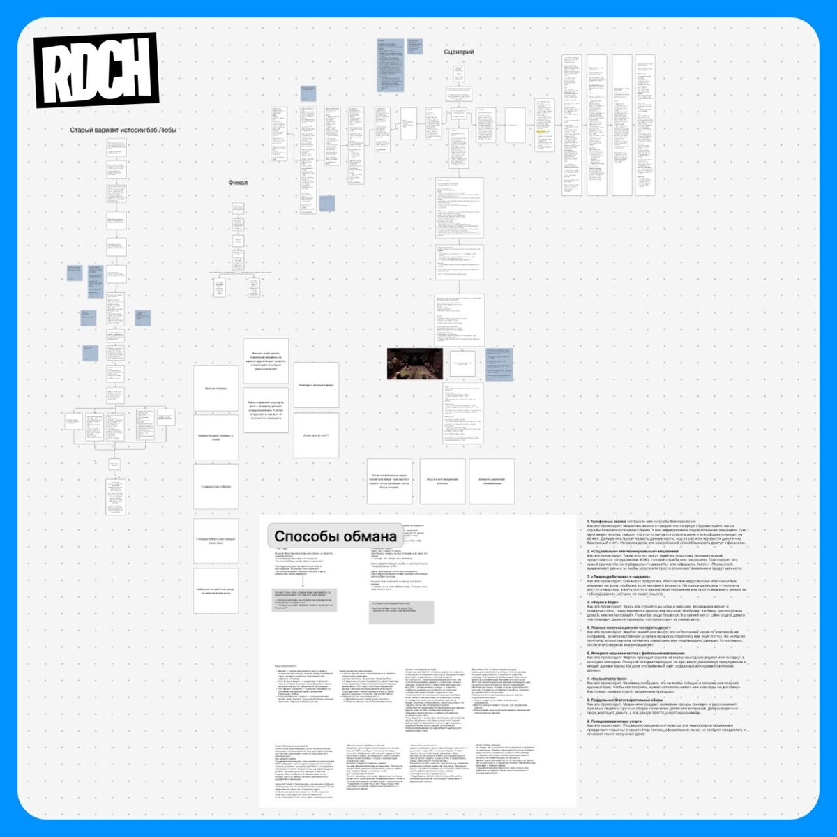разработки такого большого проекта ⚡️ Начнем с идеи и сценария проекта. Идея пришла довольно сумбурно. Мы знали, что хотим сделать что-то социальное и прикладное, поднять важную тему для социума. Были варианты из психологии, экономики, искусства. Но потом мы пришли к тому, о чем все чаще слышим в новостях - мошенничества. С этой темой может столкнуться каждый. И молодые и пожилые. Но мы решили остановиться именно на пенсионерах, на самых уязвимых жертвах мошенников. Так и родилась идея проекта - "Бабули против мошенников". Мы 100% знали, что это не будет скучный проект из разряда: вот так надо, а так не надо, конец. Мы решили преподнести полезную информацию в игровой интерактивной форме. Через геймификацию, креатив и свежий взгляд! Вся наша команда около месяца детально прорабатывала сюжетные ветки. Мы решили, что бабуль будет три: Вера, Надежда, Любовь. Да, вот так метафорично получилось!). У каждой бабули своя уникальная история, полностью проработанная сюжетная ветка, которая н