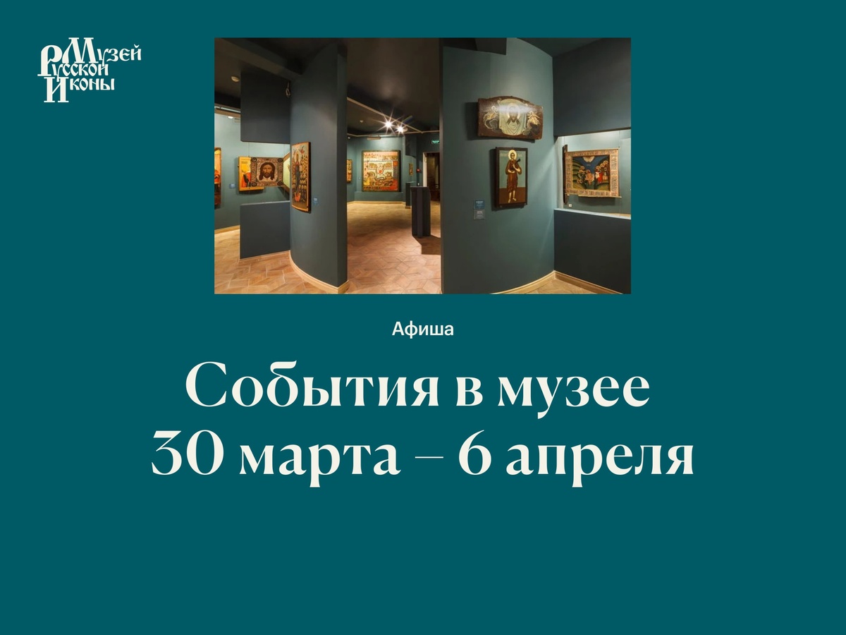 Рассказываем о мероприятиях в музее и ждем вас в гости! 🔸 С 5 февраля по 5 мая 2026 Выставка «Псковская икона «Распятие — Воскресение (Сошествие во ад)» из собрания Сергея Ходорковского. Шедевр живописи XVI столетия». Вход свободный, по графику работы музея. Подробнее о выставке 2 апреля, четверг, 19:00 Онлайн-лекция «Георгиевский собор в Юрьеве-Польском». Лектор – Ю.В. Ратомская. 🔸 Регистрация не требуется, трансляция по ссылке. Запись останется на канале. 3 апреля, пятница, 19:00 Онлайн-лекция ««Неопалимая Купина» и другие символические образы Богоматери». Лектор – В.В. Зуйков. 🔸 Регистрация не требуется, трансляция по ссылке. Запись останется на канале. Экскурсии 31 марта – 7 апреля Обзорные и тематические программы на любой вкус. • Экскурсия «Жемчужины древней части собрания. Русская иконопись XIV–XVI веков» 3, 5 апреля • Экскурсия «Искусство и культура Эфиопии» 31 марта • Экскурсия «В мастерской иконописца: техника создания иконы» 4, 6 апреля • Экскурсия «Искусс