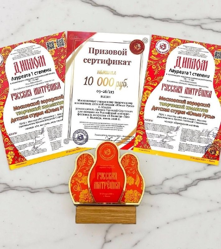 ⭐️ 28 марта детская студия Фольклорного центра «Москва» «Юные Русы» участвовала в Российском конкурс-фестивале искусств. Для коллектива это стало важным творческим событием и возможностью проявить себя на престижной сцене среди ведущих представителей народного жанра со всей страны. Выступления участников оценивало профессиональное жюри, в состав которого вошли признанные мастера: Сергей Хазов (Русский народный хор им. Пятницкого), Владислав Озерянский (ГААНТ им. Моисеева) и Екатерина Парчинская (ансамбль танца «Русские сезоны»). 💃Старшая группа ансамбля «Юные Русы» продемонстрировала высокий уровень подготовки, артистизм и сценическую культуру. По итогам конкурса коллектив показал блестящий результат, став победителем фестиваля и завоевав два диплома Лауреата I степени. Эта победа — результат большой, системной работы педагогов и самих участников, их преданности традициям народной культуры и стремления к профессиональному развитию. 🎁 Поздравляем наших юных артистов с заслуженной поб