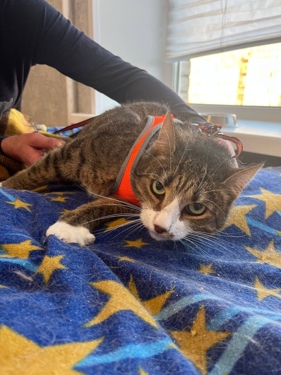 Кошечку забрала, дали габапентин, одели шлейку и ошейник
