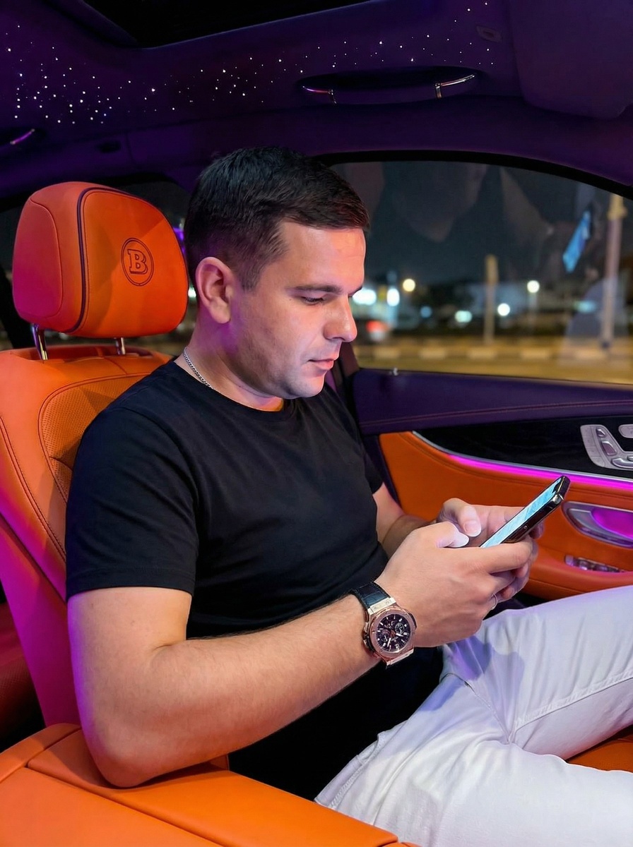 🤖Генерировать можно здесь: 👉БОТ ДЛЯ ГЕНЕРАЦИИ Режим Nano Banana 2/Pro ИНСТРУКЦИЯ Портрет молодого человека с загруженного фото. Черты лица сторого перенесены с загруженного фото без изменений-точное сходство обязательно. Он одет в стильную повседневную одежду: черная футболка, белые брюки и дорогие часы на запястье. Молодой человек сидит в роскошном автомобиле с ярко-оранжевым кожаным салоном, украшенным логотипом "B" на подголовниках, и смотрит в свой смартфон. Фон представляет собой интерьер автомобиля ночью, освещенный фиолетовой неоновой подсветкой и эффектом звездного неба на потолке. Съемка ведется с ракурса три четверти, камера находится на уровне глаз модели. Глубина резкости средняя, фокус на человеке, фон слегка размыт. Качество изображения высокое, детализированное, в стиле современной цифровой фотографии с использованием цветного света. Формат --ar 3:4. СГЕНЕРИРОВАТЬ 📸 СООБЩЕСТВО 📱