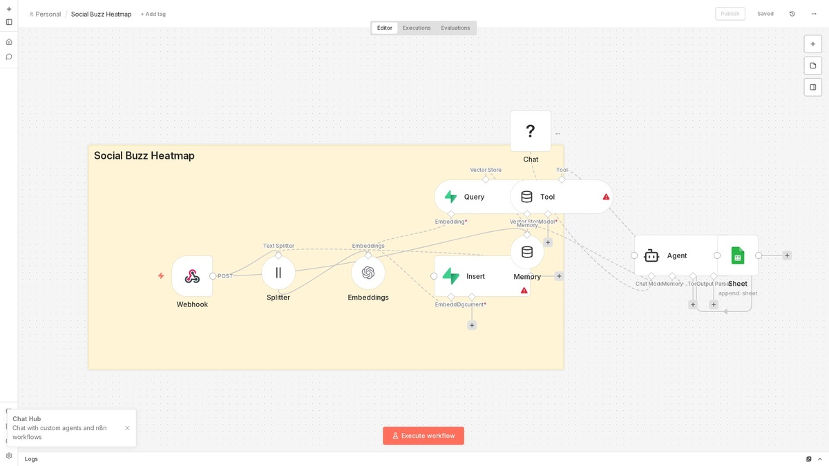 ⚡ Что делает: Автоматизация собирает упоминания о вашем бренде из социальных сетей, обрабатывает их с помощью OpenAI для создания векторных представлений и сохраняет данные в Google Sheets для анализа. Результаты визуализируются в виде тепловой карты, показывающей, где ваш контент вызывает наибольший интерес. 👥 Кому подойдёт: Маркетологам и аналитикам, следящим за эффективностью бренда. 💡 Пример: Отслеживает упоминания нового продукта в Twitter и Instagram, анализирует тональность и создает отчет. 🔗 Ноды: Agent, Embeddings Open Ai, Google Sheets, Lm Chat Hf, Memory Buffer Window 📊 Сложность: Средний #n8n #automation #nocode #aiagent #ai #embeddingsopenai ════════════════ 🎬 YouTube | ⚙️ Канал | 💬 Чат | 📮 Реклама