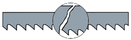 При работе ленточной пилы полотно постоянно изгибается на шкивах и направляющих роликах — каждый оборот создаёт минимум четыре цикла нагружения, а на высокой скорости частота достигает 10–15 Гц. Из-за таких циклических нагрузок в материале накапливаются повреждения: больше всего напряжения концентрируются в межзубной впадине, где зарождаются микротрещины, которые со временем разрастаются и приводят к разрыву. Распознать усталостное разрушение можно по ступенчатому рельефу излома — на нём видны зона роста трещины и зона окончательного долома.