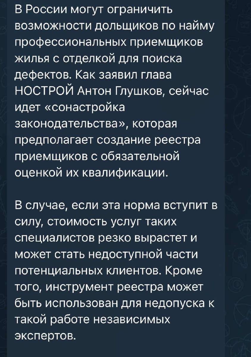 С одной стороны, потребительский экстремизм явление распространенное. А сейчас, независимых приемщиков и юристов по взысканию неустоек с застройщиков стало так много, что они уже везде в медиа и обещают золотые горы. Причем, докапываются эти приемщики часто до мелочей. Это убытки, которые застройщик размазывает потом ценой на всех клиентов. С другой стороны, совсем запрещать и делать только специальных «своих» приемщиков это тоже неправильно. Как людям тогда защищаться от реальной бракодельной практики застройщиков? Должны быть четкие и максимально подробные стандарты качества жилья, отделки, конструктивных элементов внутри и пр. Их сейчас нет, чем пользуются и застройщики и покупатели в судах. А суд трактует все как хочет, по настроению. Отдельно отмечу, больше всего от потребительского экстремизма страдают небольшие застройщики ИЖС, у них нет такого объема и запаса прочности, который позволит безболезненно просто включать эти выплаты в бизнес-модель.