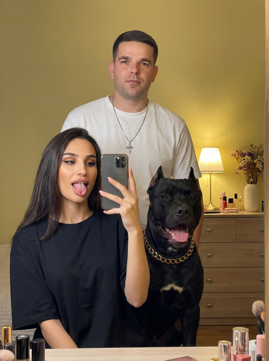 🤖Генерировать можно здесь: 👉БОТ ДЛЯ ГЕНЕРАЦИИ Режим Nano Banana 2/Pro ИНСТРУКЦИЯ Селфи в зеркале молодой пары с их собакой. На переднем плане девушка с загруженного фото с длинными темными волосами и выразительным макияжем, она игриво показывает язык. Она одета в простую черную футболку оверсайз. За ней стоит привлекательный мужчина с загруженного фотт, в модной футболке белого цвета и уверенным взглядом в камеру; на шее у него серебряная цепь с православным крестом. Между ними — крупная черная собака породы питбуль или стаффордширский терьер с открытым ртом и золотой цепью на шее. Фон — уютная комната с желто-зелеными стенами, виден комод с косметикой, настольная лампа и ваза с сухоцветами. Освещение теплое, мягкое, создающее интимную атмосферу. Ракурс камеры — типичное зеркальное селфи, снятое с уровня груди. Глубина резкости небольшая, фокус на лицах людей и собаки, фон слегка размыт. Качество изображения высокое, четкое, в стиле популярной фотографии для социальных сетей (Instagr