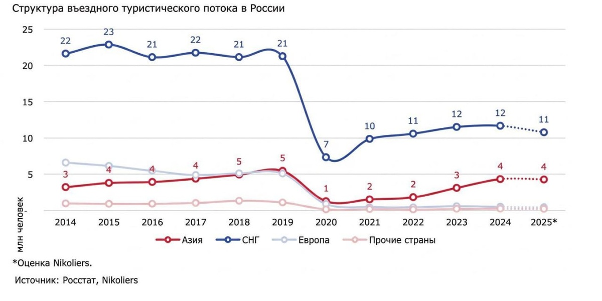 ❗️За 10 лет въездной турпоток в Россию так и не вернулся к доковидным уровням, но постепенно восстанавливается за счёт «новой географии» — стран СНГ, Азии и Персидского залива, где растёт интерес к путешествиям в Россию.