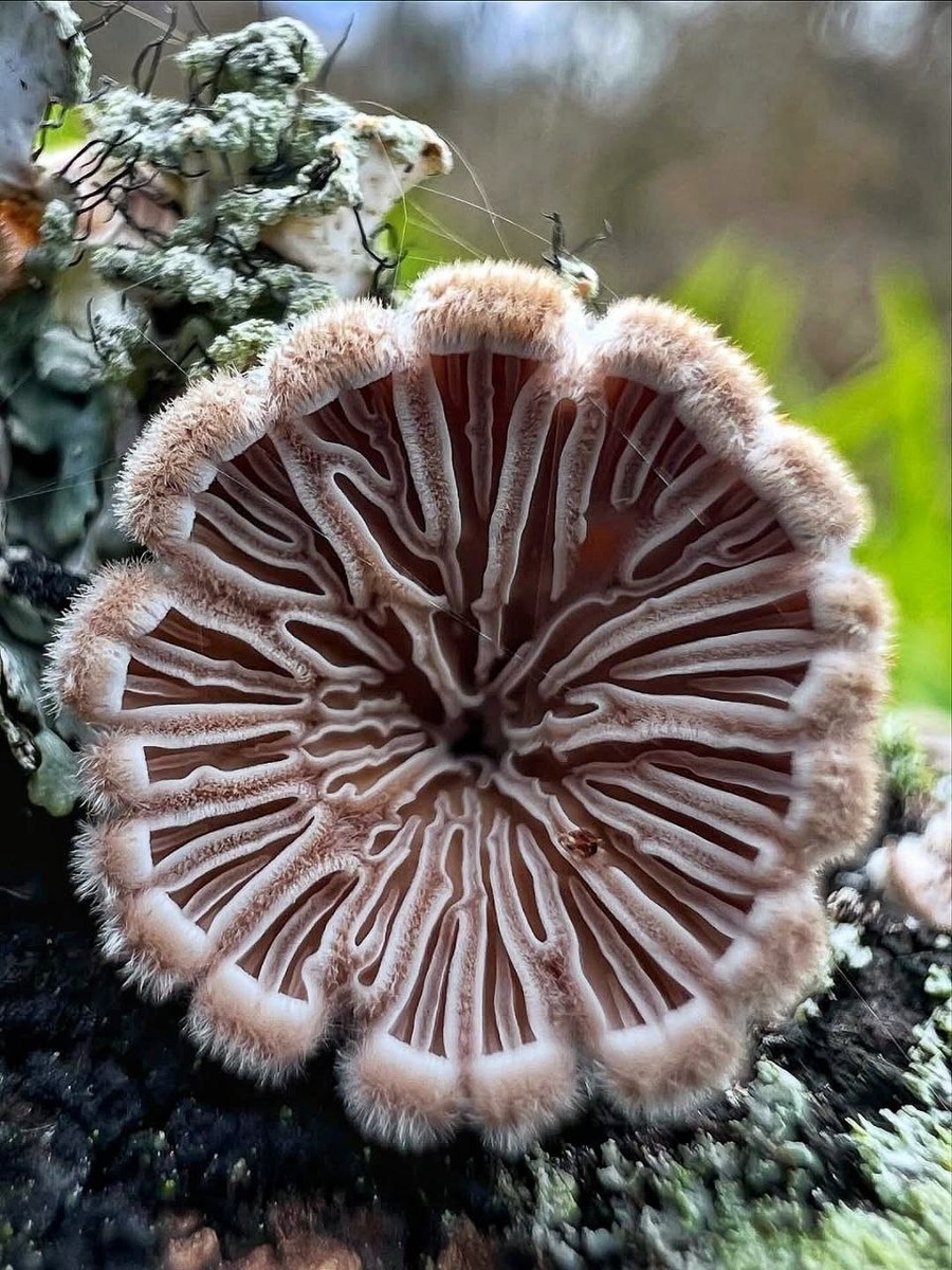 ) 🌳 Этот миниатюрный гриб — настоящий космополит и мастер выживания. Его можно встретить практически в любом лесу, парке или саду, где есть старая древесина. Он охотно селится на поваленных стволах, пнях и сухих ветвях лиственных, а иногда и хвойных деревьев. Благодаря своей невероятной устойчивости к засухе, он может полностью высохнуть, превратившись в «сухарик», а после первого же дождя снова ожить и продолжить расти. 🍄 Его внешность невозможно перепутать ни с чем другим. Сверху шляпка покрыта густым белым или пепельно-серым мехом, а снизу скрывается настоящее чудо инженерной мысли природы — пластинки, которые продольно расщеплены на две части. Именно за эти «щели» гриб и получил свое название. В сухую погоду края пластинок заворачиваются внутрь, бережно пряча споры от пересыхания, что делает его похожим на изящный морской коралл или раскрытый веер. 🌏 Несмотря на скромные размеры, этот гриб приносит огромную пользу. В природе он работает как эффективный «санитар», перерабатыва
