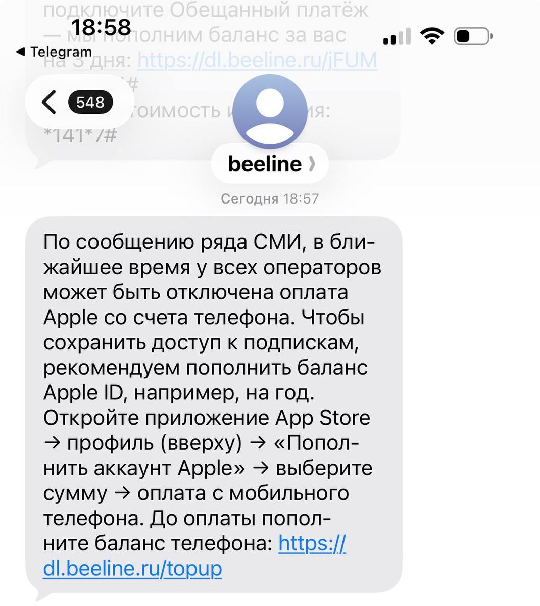 Билайн начал рассылать абонентам предупреждения об отключении функции оплаты приложений в AppStore через счет мобильного телефона.