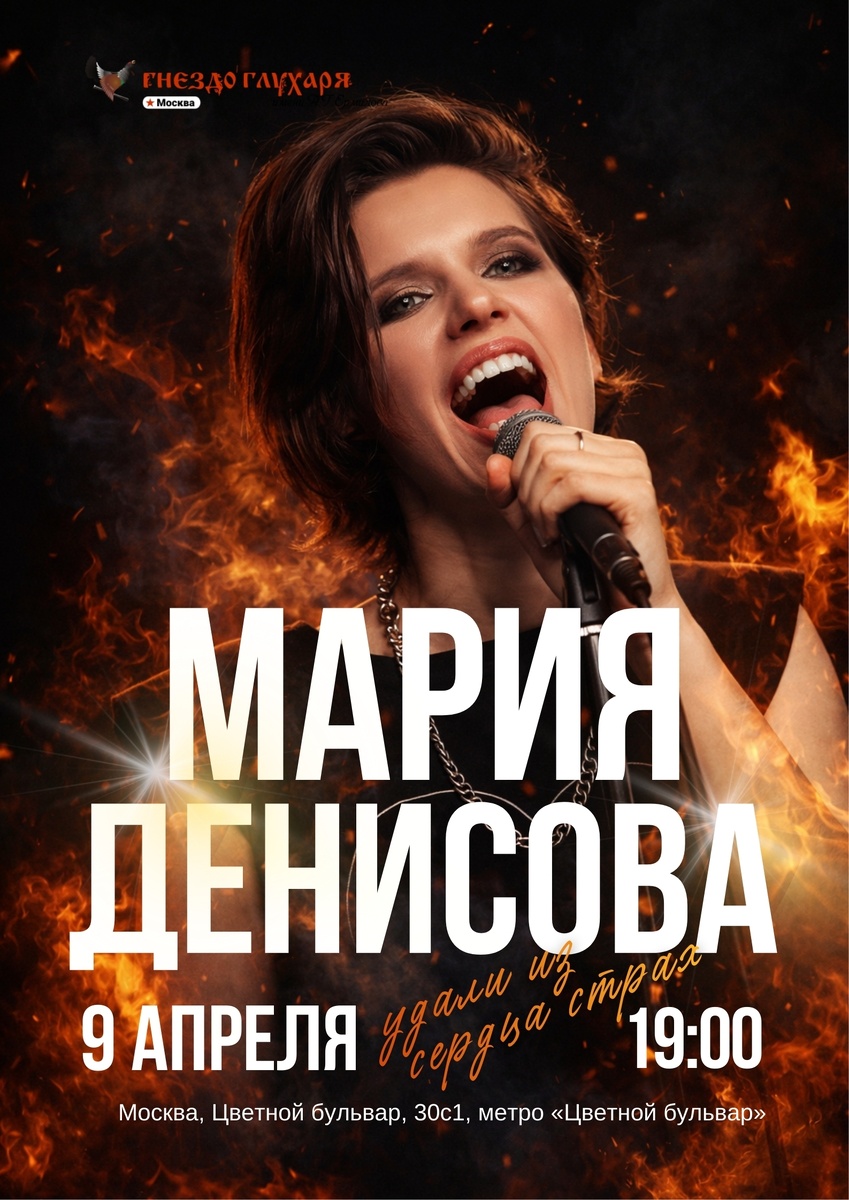 9 апреля состоится сольный концерт артистки Марии Денисовой в клубе "Гнездо глухаря" — одном из любимых эпицентров творческих событий москвичей в центре столицы. Мария Денисова — певица, поэт и композитор, преподаватель эстрадного вокала. Участница шоу "Царица" на телеканале Пятница, автор книг-бестселлеров "Хочешь петь? Пой!" и "Хочешь петь хиты? Пиши!".