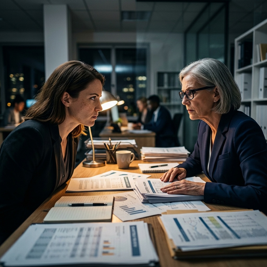 На четвёртый день в офис приехали двое из головного. Мужчина в сером костюме и женщина с папкой — аудиторы. Они закрылись с Жанной в кабинете на два часа. Через стеклянную стену я видела: Жанна сидела прямо, губы поджаты, пальцы — на столе, неподвижно. Потом она что-то говорила — много и быстро. Потом замолчала.