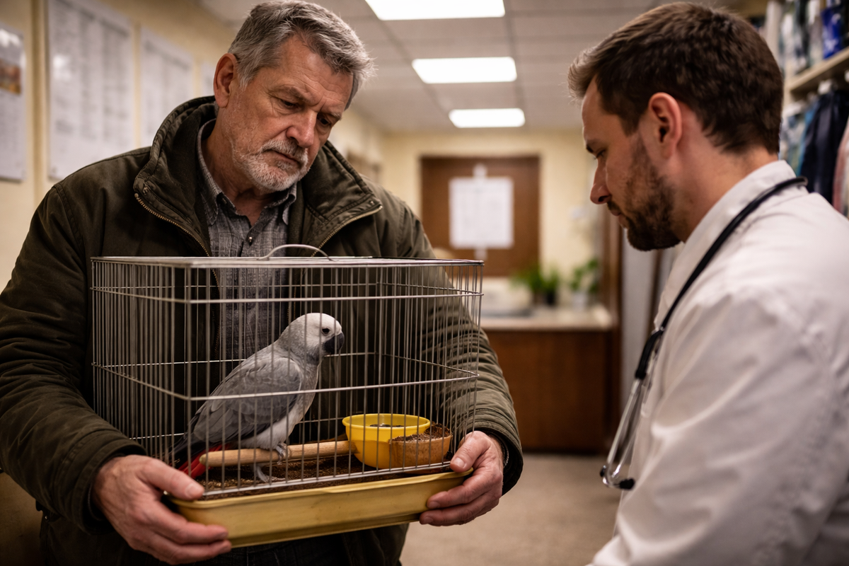 Я открыл клетку, аккуратно достал Гришу. Тот не сопротивлялся, только один раз цапнул воздух для порядка. Попугай был действительно старый. Не катастрофа, не “всё, конец”, а именно старость. Та самая, которую люди почему-то до последнего считают болезнью, потому что очень не любят её ни в себе, ни в других. Когти переросли, оперение тусклое, вес снижен, суставы уже не те, но глаза ясные. Не умирающий. Не агонизирующий. Просто пожилой, запущенный и, судя по всему, давно живущий в доме, где стало не до него.