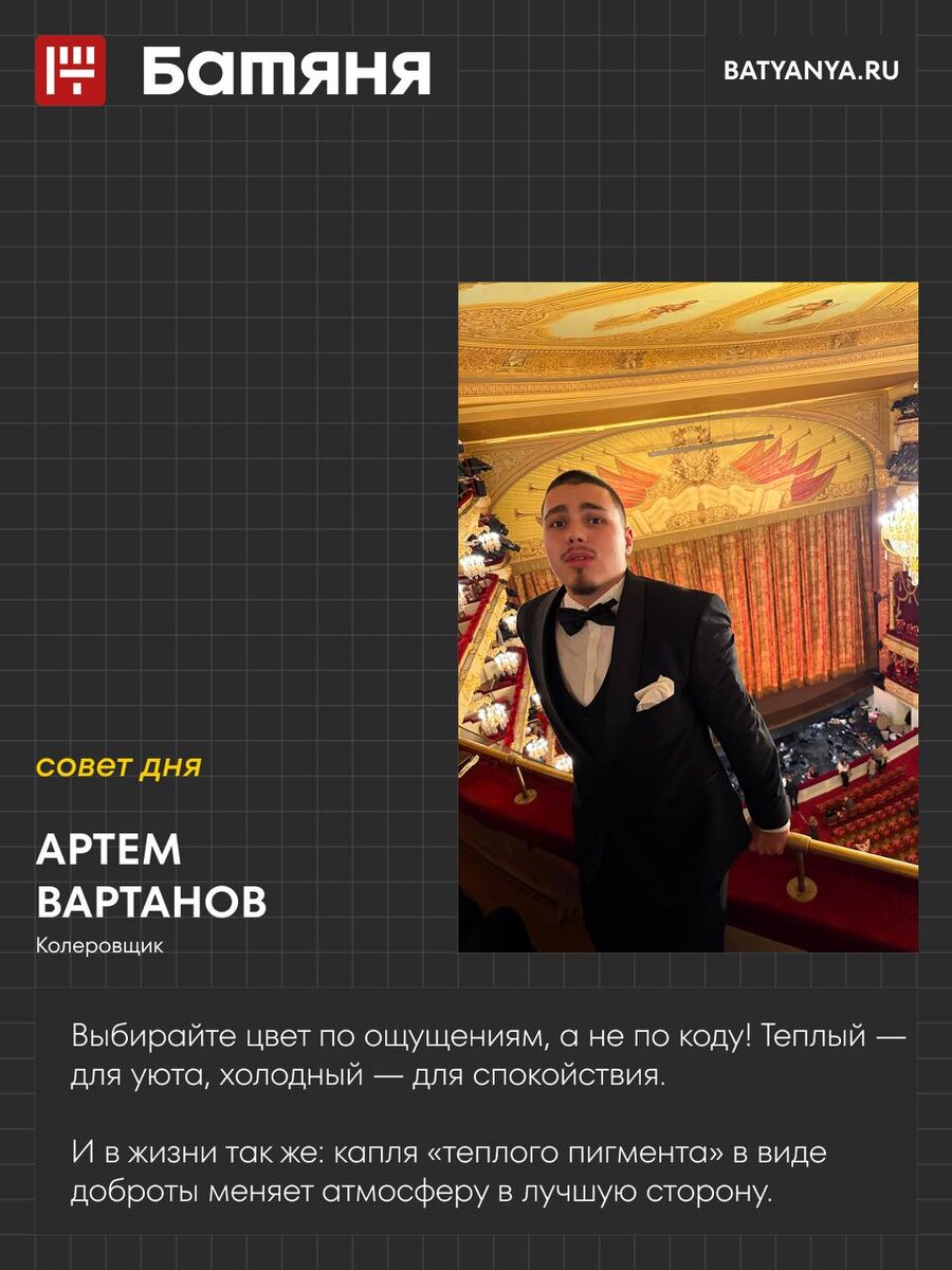 !✨ Сегодня в рубрике — Артём Вартанов, мастер, который знает, как смешать идеальный цвет для вашей души. «Забудьте про скучные каталоги! Выбирайте оттенок, который чувствуете сердцем. Тёплый — для домашнего уюта, холодный — для дзен-атмосферы. 🧘♀️ А главный секретный ингредиент — он не в банке! Капля «тёплого пигмента» доброты в жизни меняет всё. Так что, колеруйте мир с улыбкой!» Заглядывайте в «Батяню» за правильными оттенками и настроением!
