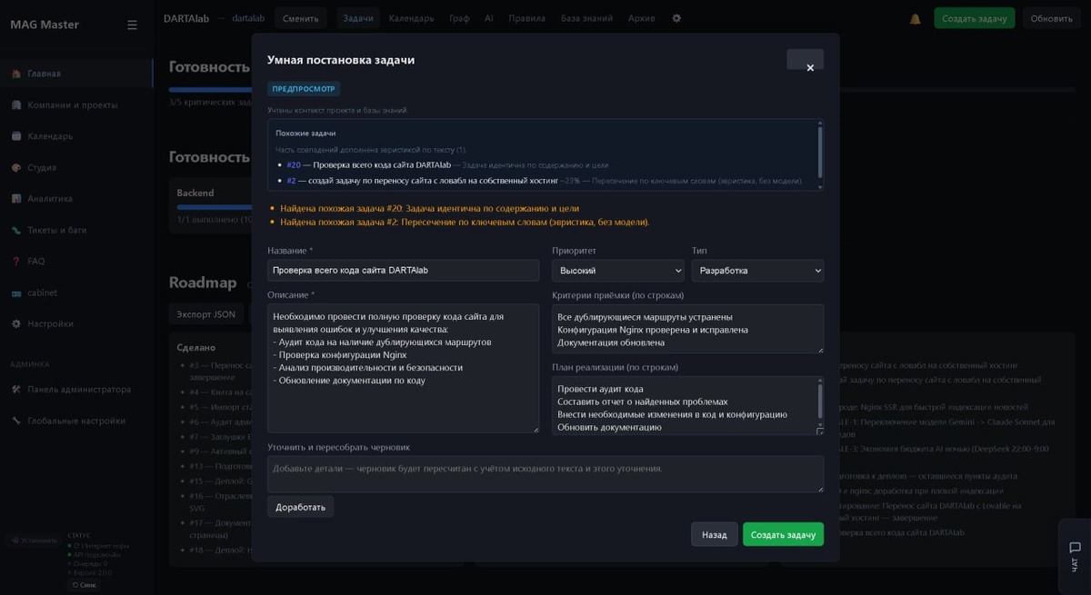 ❤️🔥 Улучшили функционал умной постановки задач. Ранее задача ставилась в 1 этап теперь в 2, на первом скрине вводите задачу. В нашем случае: *Создай задачу проверки всего кода сайта* Что происходит дальше? Настроена гибридная связки Эвристики и ИИ. Модель бежит смотреть задачи которые в отрытом состоянии , далее смотрит в Базу знаний и предлагает формулировку новой задачи , если находит схожие задачи предлагает. После чего вы можете либо поставить задачу либо ее доработать либо отменить. База знаний используется для контекста проекта. Логика знаний в нашей A-CRM следующая: Пользователь создает компанию: ❤️🔥У компании есть База знаний общая. Внутри компании пользователь создает проект. Проектов или Рабочих пространств в системе есть уже несколько типов ❤️🔥Программист - задачи для разработки программного обеспечения ❤️🔥Маркетинг - для работы рекламщиков и маркетологов ❤️🔥Продажи - для работы отдела продаж ❤️🔥Классический - без специфических настроек ❤️🔥Стартап - по