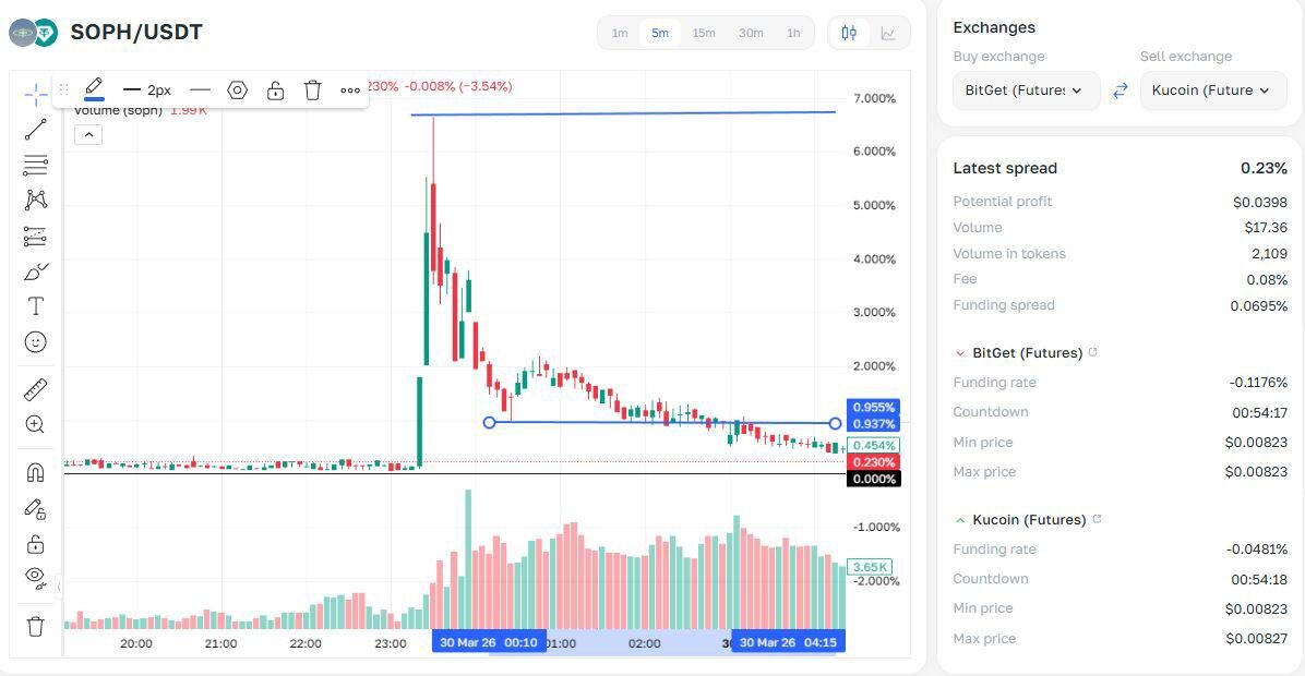 ? Возникает вопрос: Что на рисунке? Это наш инструмент график истории спредов на котором видно что спред по двум монетам сначала резко разошелся, потом сошелся 🐸 Что значит разошелся и сошелся? Цена на двух биржах на один и тот же актив были разные. Какая аналогия в реальном мире? Цена на бананы в магазине Окей 200 рублей за кг Цена на бананы в магазине Лента 300 рублей за кг Это одни и те же бананы. Значит мы можем прогнозировать что ценники в этих двух магазинов через какое то время сойдутся Например в магазине Окей цена станет 260 рублей и в магазине Лента 260 рублей. Так и работает арбитраж криптовалют. Когда мы видим спред - мы понимаем что тут неэффективность рынка и пользуемся ею.