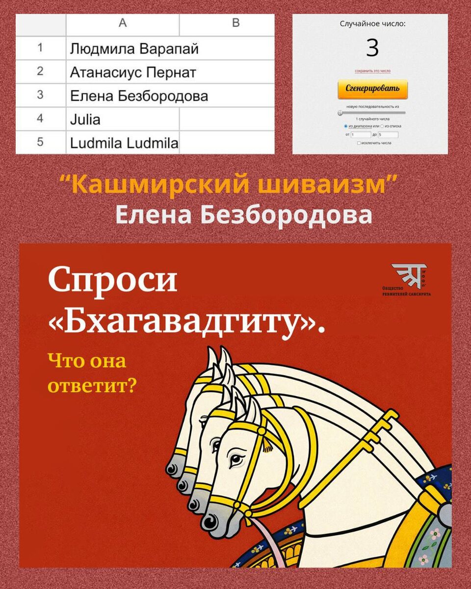 ! Дарим запись курса «Кашмирский шиваизм. Часть 1»! 🎁 Поздравляем победителя 3 — Елена Безбородова. Розыгрыша провели и запускаем новый! Запись курса «Кашмирский шиваизм. часть 1» Может стать вашей! Просто сделайте репост этой записи к себе на страницу, и вы автоматически участвуете в розыгрыше. Итоги подведем через несколько недель. А теперь — мудрость дня! Спроси «Бхагавад-гиту». Что она ответит? «Бхагавад-гита» — это 700 стихов-шлок, в которых заключена вся философия жизни. Диалог, который ведёт к глубокому понимаю. Предлагаем необычный формат: позвольте этой мудрости «ответить» и вам. Это не гадание, а скорее игра-размышление, точка для внутреннего диалога. Как это работает: 1. Загадайте вопрос, тему или просто своё состояние. 2. Напишите в комментариях любую цифру от 100 до 200. 3. Мы откроем «Бхагавад-гиту» на стихе (шлоке) с этим порядковым номером и опубликуем его для вас в ответ. 4. Прочтите. Подумайте, как эти слова могут резонировать с вашим запросом или текущим м