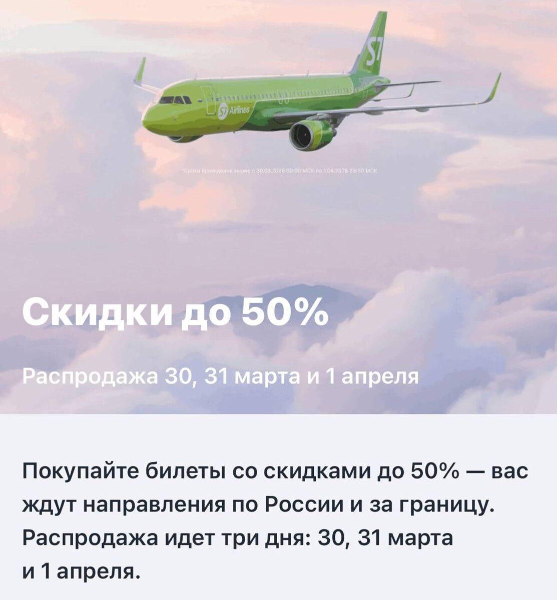 Покупайте билеты со скидками до 50% — вас ждут направления по России и за границу. Распродажа идёт три дня: 30, 31 марта и 1 апреля.