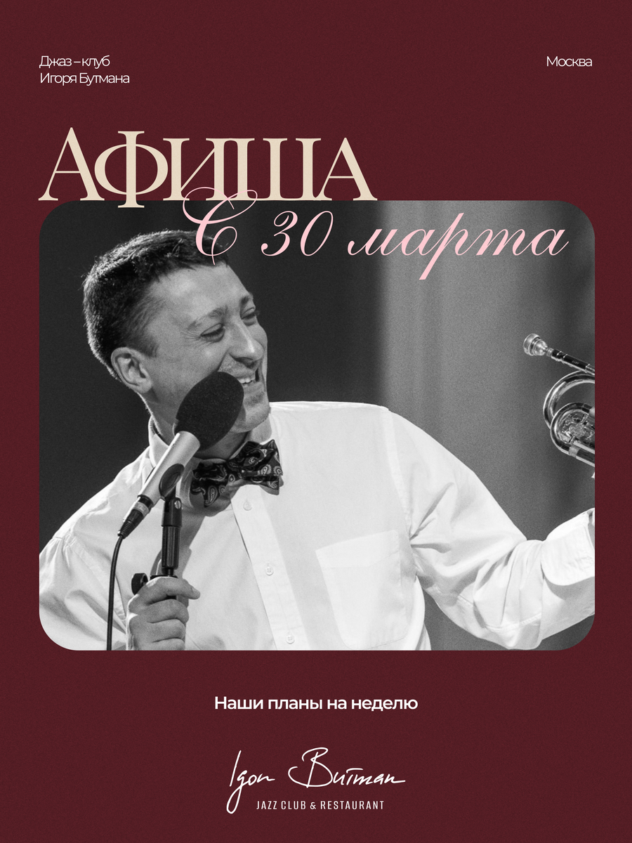 Апрель в Москве начинается с джаза и правильной атмосферы. Ждем вас каждый день в клубе! ❤️ Наши планы на неделю👇: 🌷30 марта (понедельник), 19:30