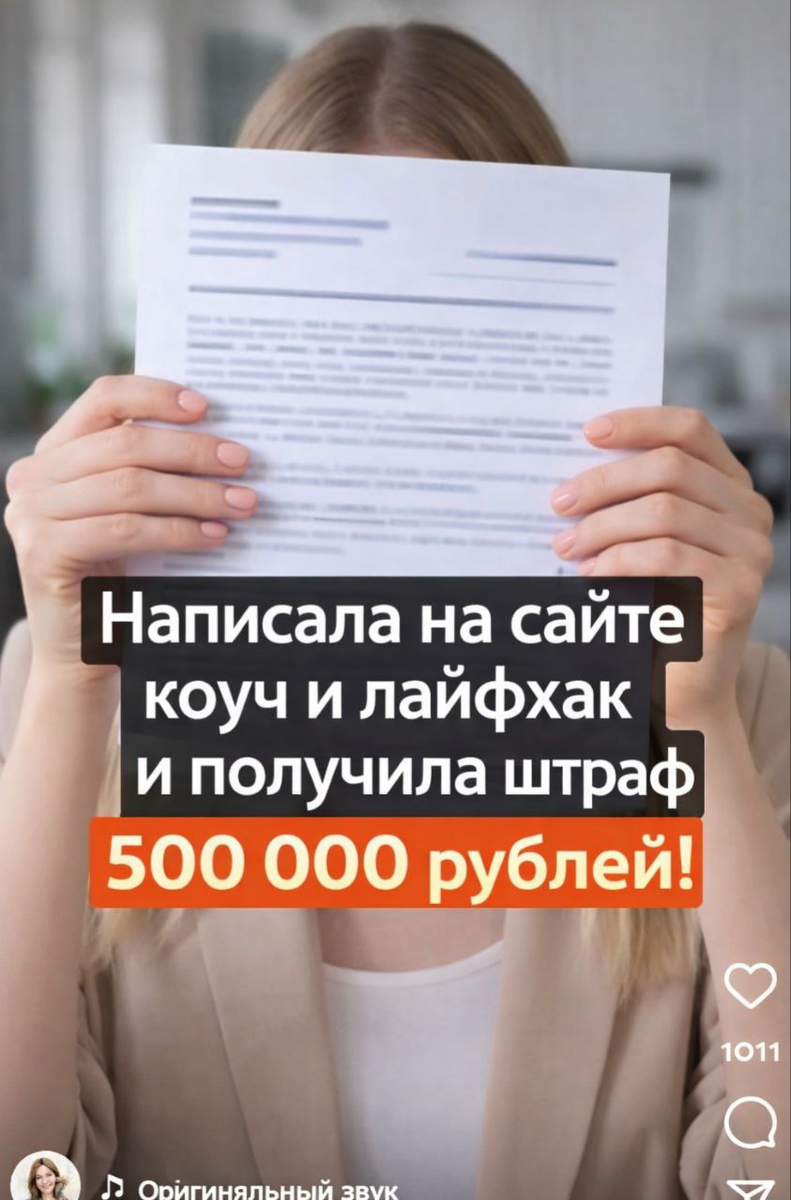 Конечно же, на страхах. Видите скриншот? Таких примерно рилс мне подгоняет Инста* постоянно и давайте я вам покажу, что тут происходит. Рилс эти пишут все кому не лень некоторые юристы чаще в целях сбора базы, потому что под такими рилс идут предложения прислать какую-нибудь памятку или гайд или еще что-то. Я совершенно не против бесплатных материалов, но вот формат привести в базу людей мне не очень импонирует. Давайте разберем, что написано на скриншоте. Написала на сайте коуч и лайфхак и получила штраф 500 000 рублей! Конкретно этот текст я взяла с рилс юриста. Целевая аудитория таких рилс в юридических блогах — эксперты. В первую очередь коучи, конечно же. И в этой фразе защиты сразу несколько манипулятивных приемов: Во-первых, преподносится все, как доказанный, а главное уже случившийся факт. Никаких сносок и оговорок типа "возможен штраф", "в определенных случаях", "при условии" не делается. Написала и получила, причем сразу 500 000 рублей. Какие-то реальные основания и обоснован