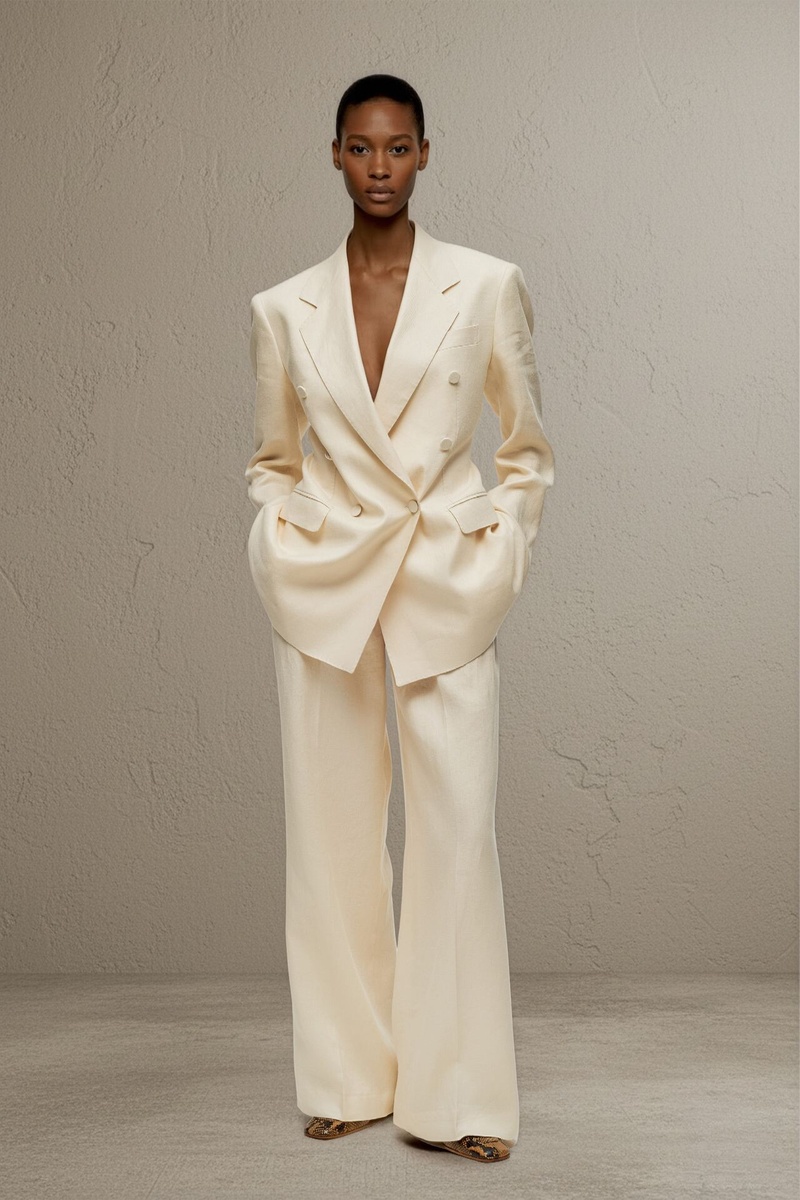 Не каждый лукбук хочется рассматривать до конца. Но Tagliatore весна–лето 2026 цепляет тем, что здесь нет перегруза и моды ради моды. Это не гардероб на все случаи жизни, зато это очень точный пример того, как может выглядеть собранный городской стиль — спокойный, элегантный и современный. Главная сила коллекции — в хорошем крое и понятных вещах, которые легко представить в жизни. Здесь много костюмов, широких брюк, бермуд с жакетами, светлых пальто, рубашек и фактурных комплектов. Все выглядит дорого не из-за вычурности, а за счет посадки, ткани и спокойной палитры. Особенно хорошо у Tagliatore получаются светлые и нейтральные костюмы. Молочный, песочный, серый, бежевый, черный — такие оттенки делают гардероб визуально дороже и легко сочетаются между собой. Это как раз те вещи, которые не кричат о моде, но сразу собирают образ. Отдельно стоит обратить внимание на бермуды с жакетом. Не самый универсальный вариант, но здесь он выглядит очень современно. А широкие брюки и удлиненные жаке