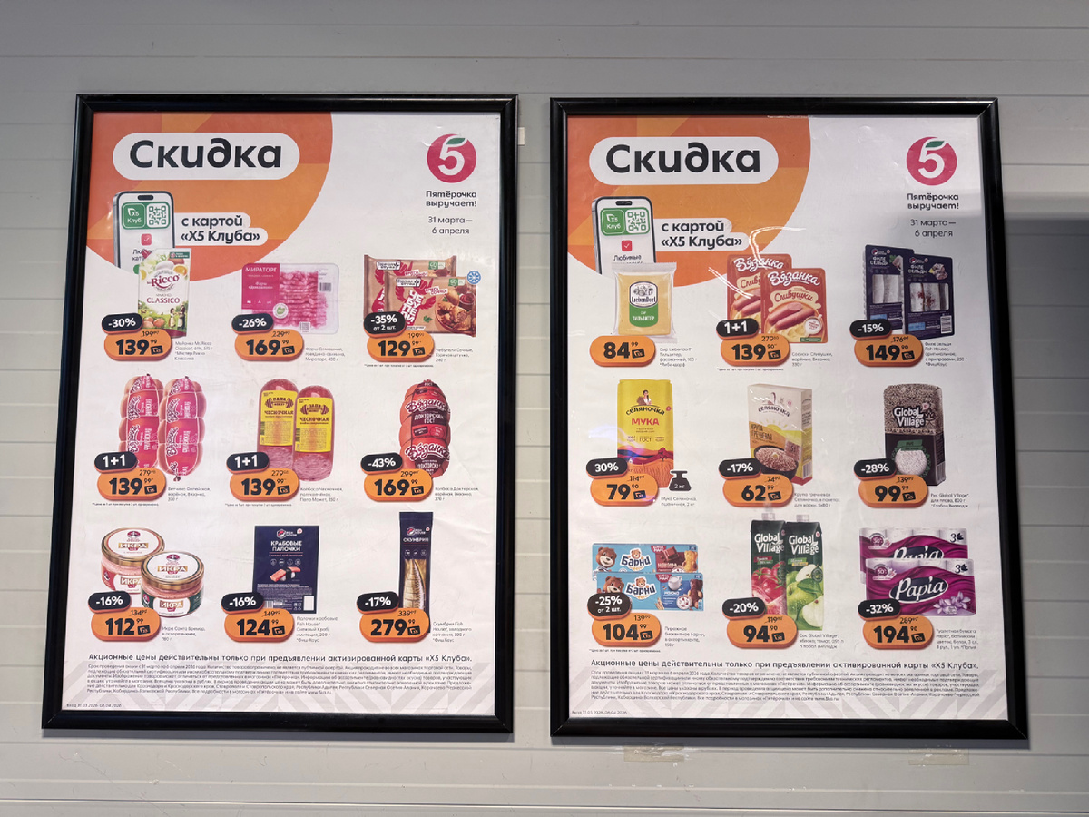 Начну сразу со входа. Уже вывесили свежие акции — можно сразу ознакомиться с продуктами, которые будут продаваться со скидками на этой неделе.
