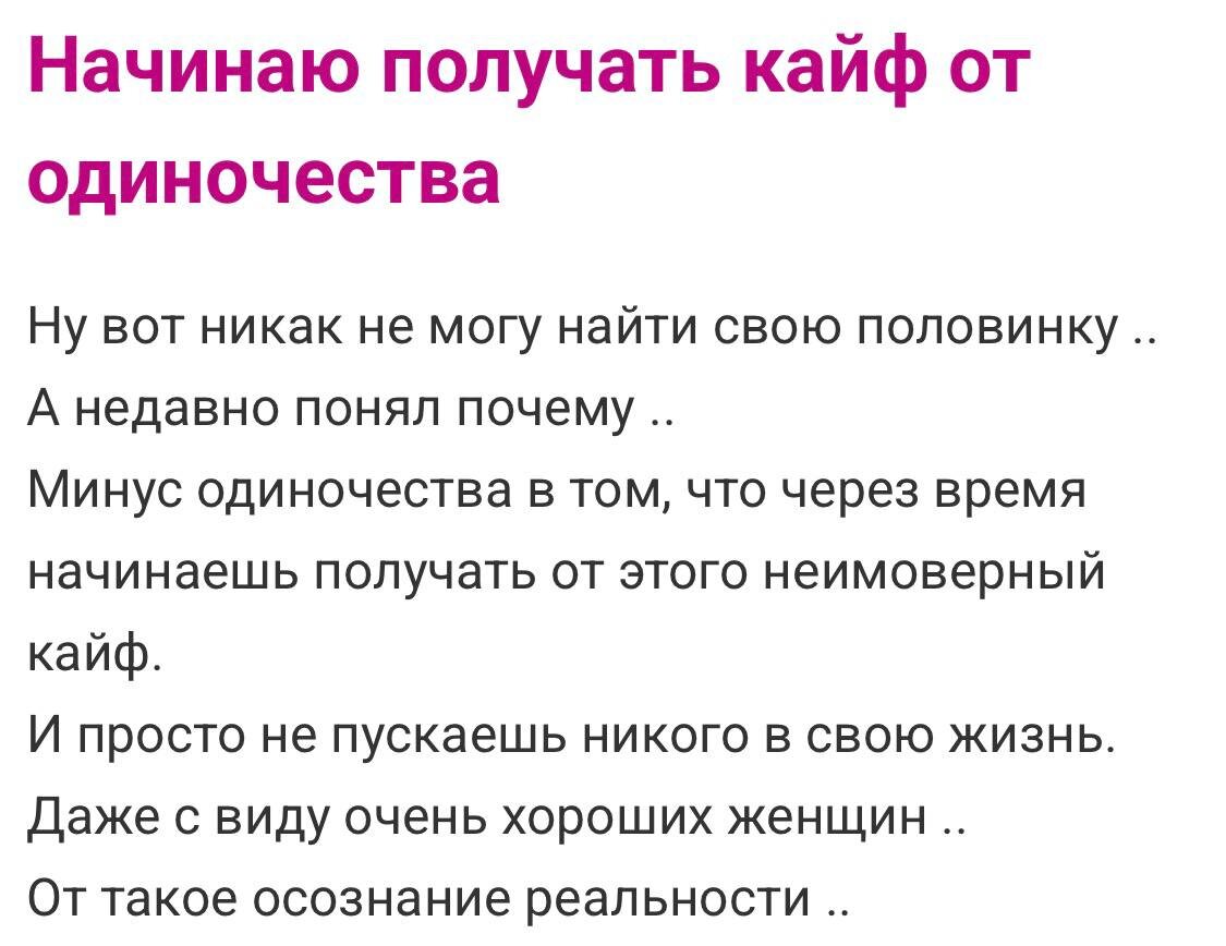 Годами общество пытается продать нам идею «второй половинки», как будто мы — бракованный товар, сошедший с конвейера недоукомплектованным. Но в какой-то момент наступает системное прозрение: быть целым — не просто выгоднее, это стратегическое преимущество. Когда твой внутренний драйвер не настроен на бесконечный поиск «того самого» или «той самой», жизнь превращается в концентрированный кайф от свободы. И даже «очень перспективные варианты» на горизонте вызывают лишь вежливое недоумение. Зачем ломать то, что и так идеально работает? 👉 Краткий мануал по автономности: 😏 Кайф от одиночества — это не баг, это фича. Это признак того, что система повзрослела и больше не ищет внешние костыли, чтобы почувствовать себя счастливой. Быть одному — не страшно. Страшно впустить кого-то, кто начнет переставлять мебель в твоем внутреннем мире и сорить крошками в твоем спокойствии. ❓ А как у вас с внутренней тишиной? Умеете наслаждаться автономным режимом или всё ещё ищете, кем бы заполнить «пустоту»